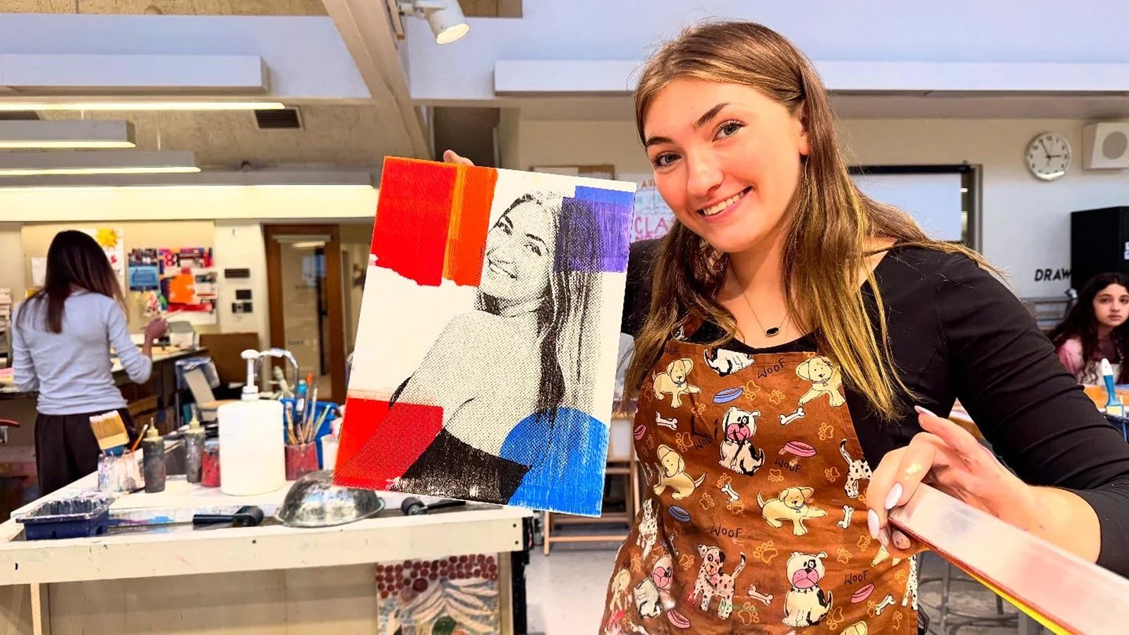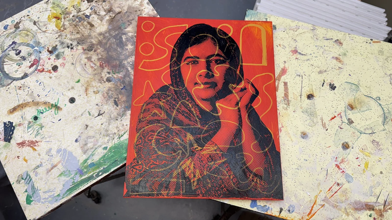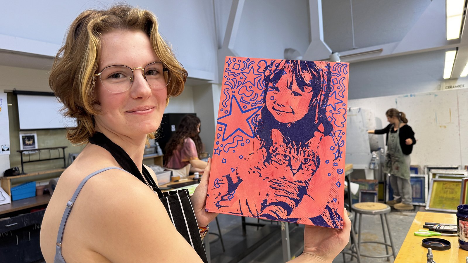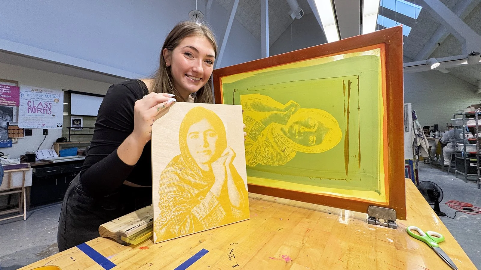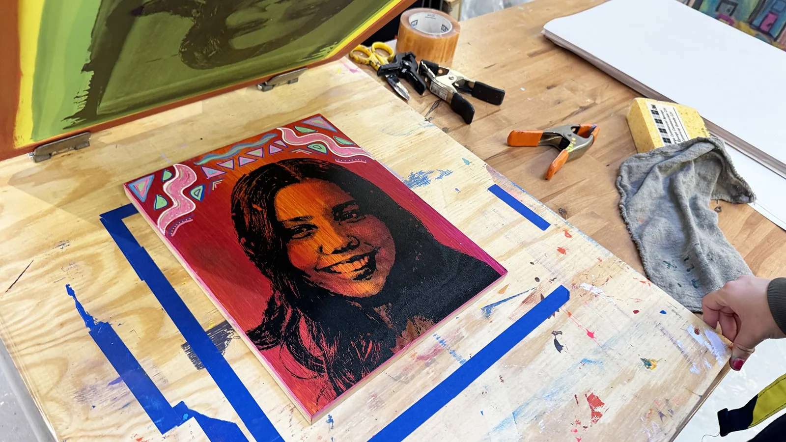 Young Artists and Writers Festival: A mono screen printing portrait workshop, inspired by pop artists past and present. Working with juicy one-of-a-kind color blends, drips, drags, pulls, painting, stencil, and handmade mark making, we combined this colorful and painterly mixed media approach to our individualized portraits on wood panels.